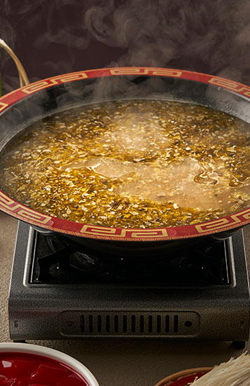 汤色明黄鲜亮;味浓料足,酸辣可口;多样吃法不单调